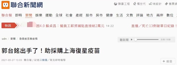 Wbtwaguybe9 Om from www.cmmedia.com.tw Re:新聞佛光山捐50萬劑疫苗!郭台銘跟進? 當時我還建議去購買兩種疫苗代工權,如果 去接觸,恐怕現在已經開始量產了。 不過我當時就預計到蔡政府是不會再買進口 疫苗的,當時就猜到蔡政府要押寶本土疫苗 了。 但有網友留言問,疫情指揮中心稱就算捐贈也要中央與原廠簽約採購,是否影響捐贈疫苗困難。 郭也親自回覆肯定表示,「會」,留言反再引起討 不過該網友追問,「請問郭董有什麼方式來應對? 」郭即未再回應。 有趣的是,郭台銘的回覆也引發網友討論,有人就驚訝的留言「哇靠郭台銘也會看. 印度製藥大廠dr reddy's laboratories (drl)於本(9)月16日對外表示,將向印度中央藥品標準管制機構(central drugs standa.