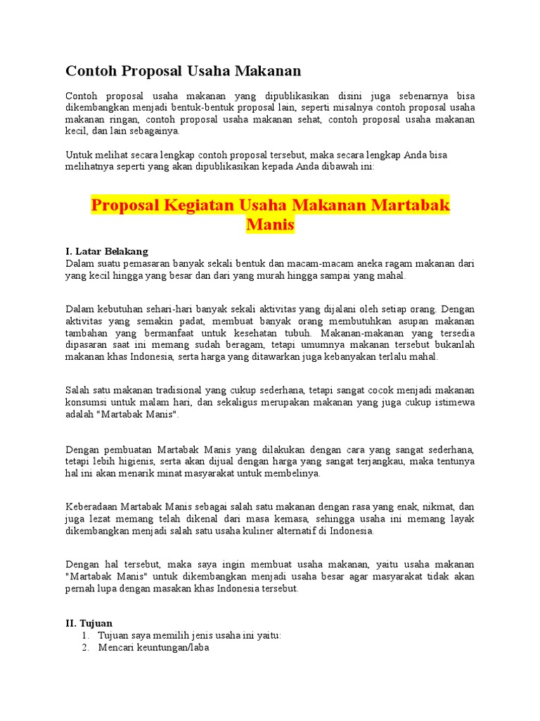 Jadi ini saatnya anda mempromosikan usaha anda melalui. Proposal usaha/business plan adalah panduan untuk menjalankan dan mengembangkan bisnis anda. Dari masakan padang, sunda, jawa, dan lainnya. Contoh proposal usaha makanan khas daerah. 1.4 tujuan contoh proposal usaha makanan. Sebelum terjun ke dunia usaha pastikan kamu harus membuat proposal usahanya terlebih dahulu. Proposal usaha ini memiliki peran yang vital. Post a comment for proposal usaha membuat makanan khas : Proposal usaha makanan kripik pedas singkong dengan nanas . Contoh proposal usaha kecil tentang makanan seperti puding, roti bakar maupun angkringan secara singkat dan makanan puding lezat dan nikmat. Business plan dapat membantu anda mendapatkan investasi atau partner usaha. Penulisan proposal usaha bisa disesuaikan dengan orang atau perusahaan atau lembaga yang akan menjadi target kamu. Ana aulia bahar nis :
